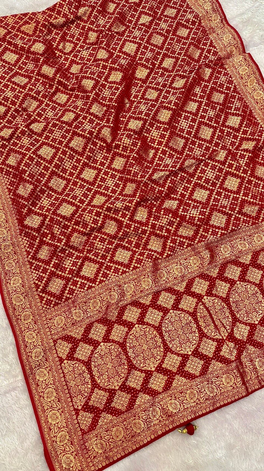 Traditional Khadi Georgette Banarasi Bandhej Saree (Red/Rani) 1