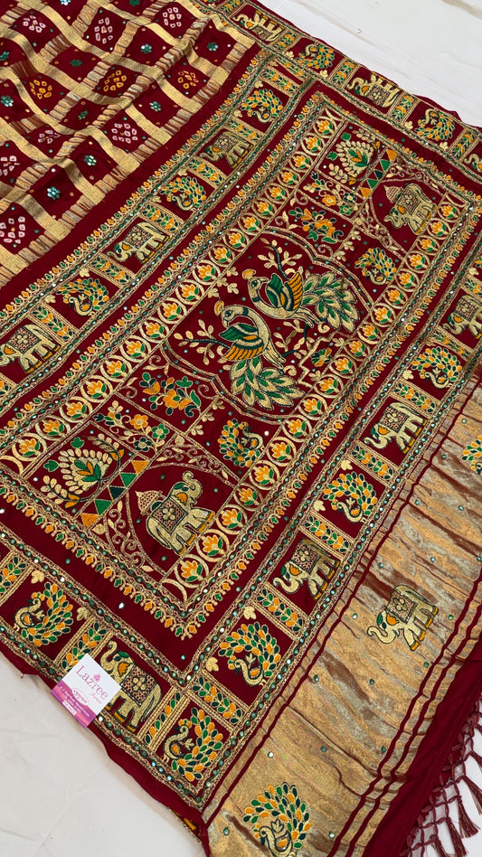 Pure Gaji Silk Handbandhej Gottapatti work Saree (Maroon)