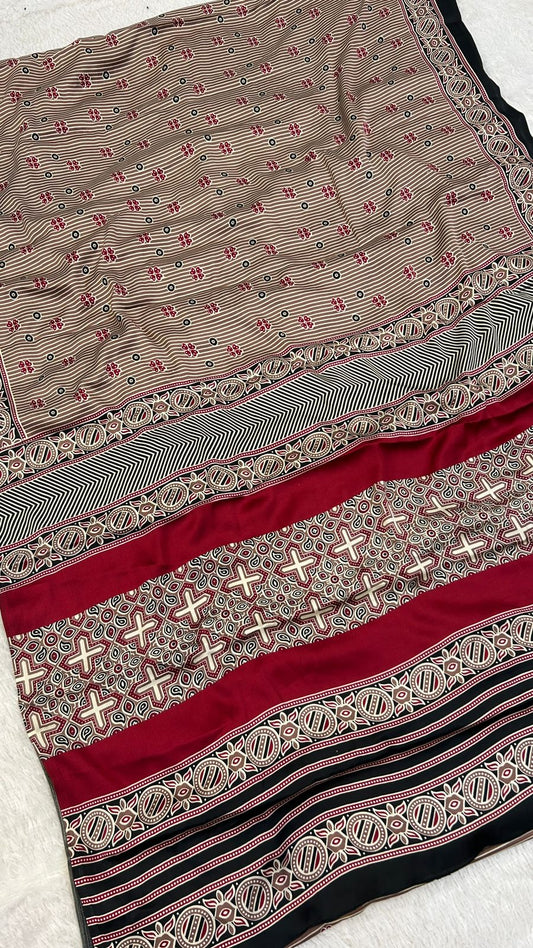 Vintage Ajrakh Bandhej Saree (Rayon Silk)