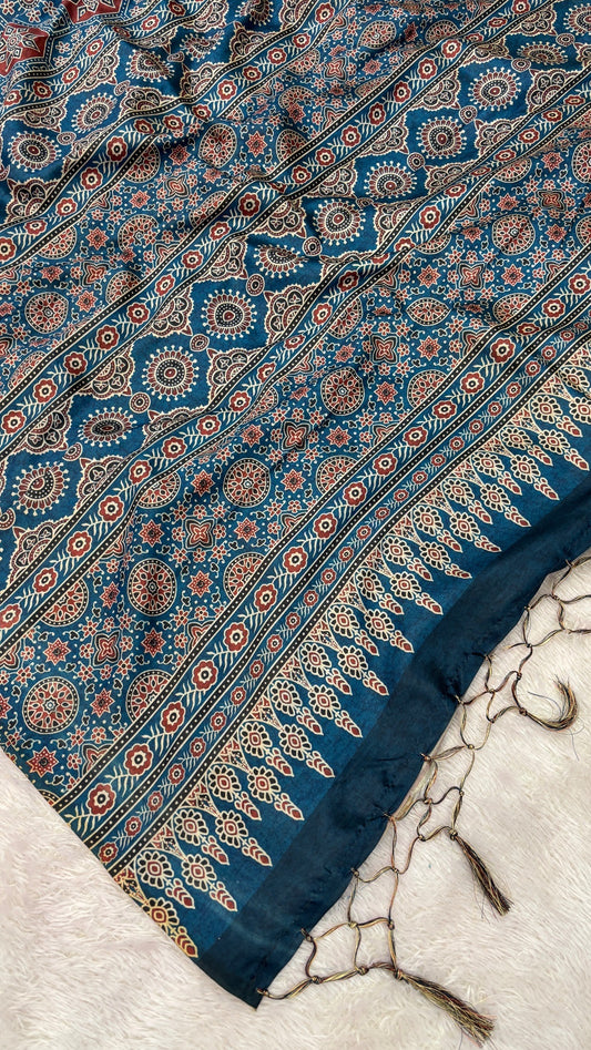 Pure Modal Silk Ajrakh Saree with Lagadi Patta Vol.2 (Blue)