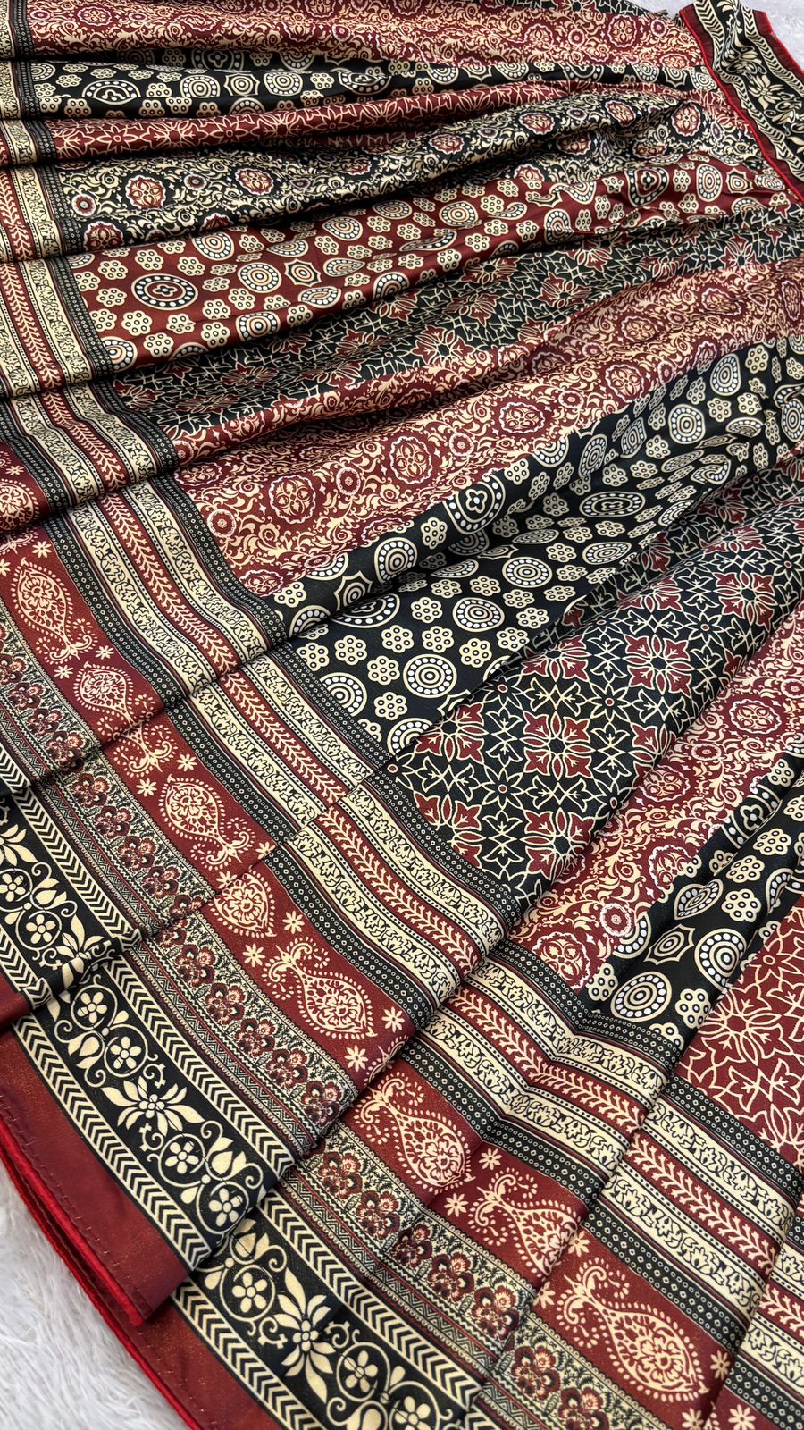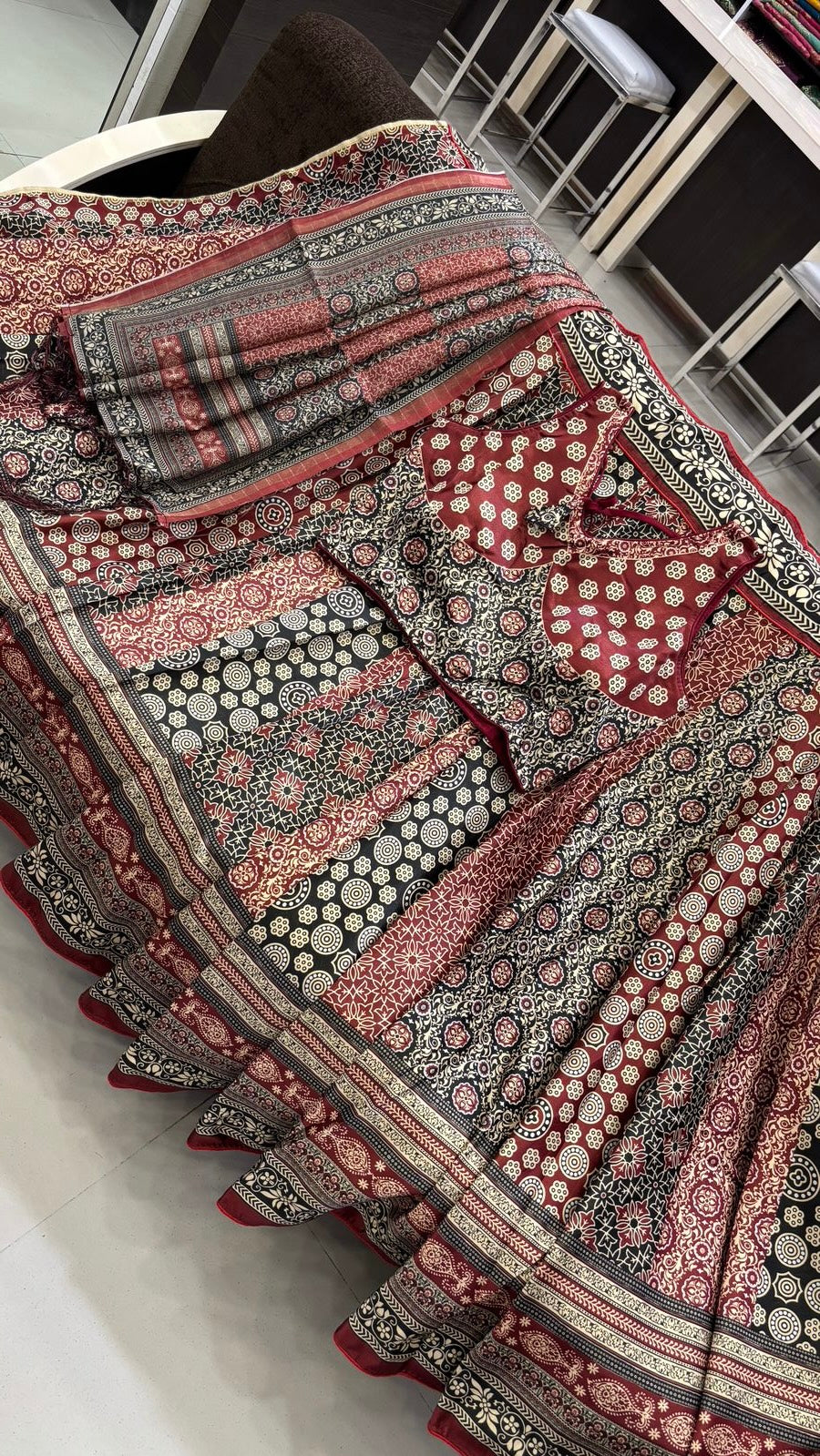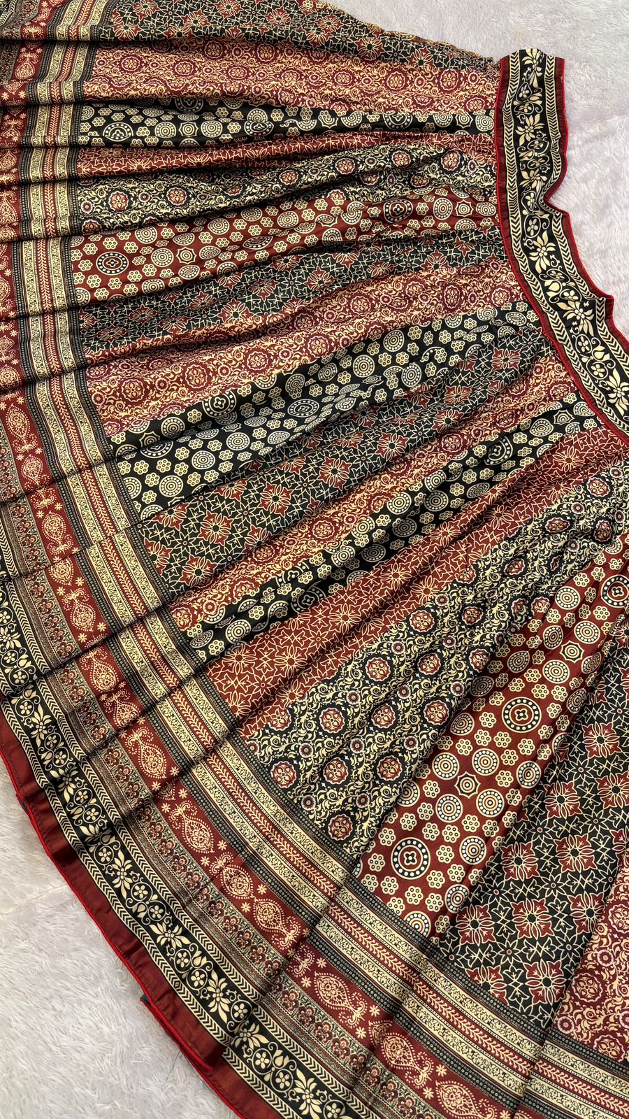 - The combination of the grand flair, Ajrakh design, and thoughtful details make it an ideal outfit for those who appreciate cultural richness and want to make a lasting impression at special occasions.