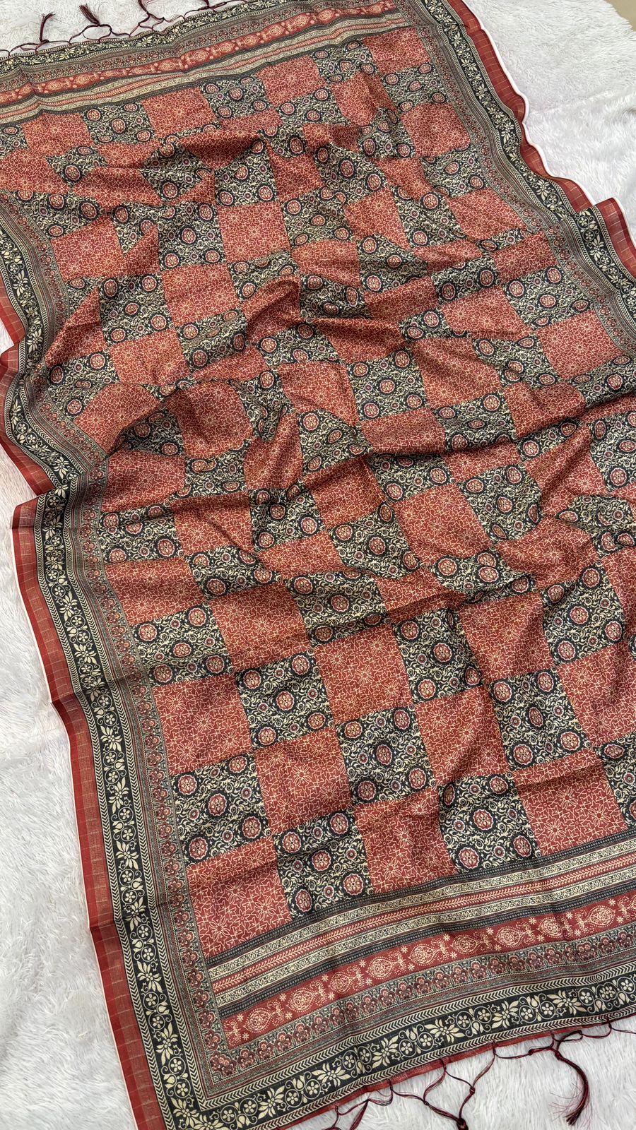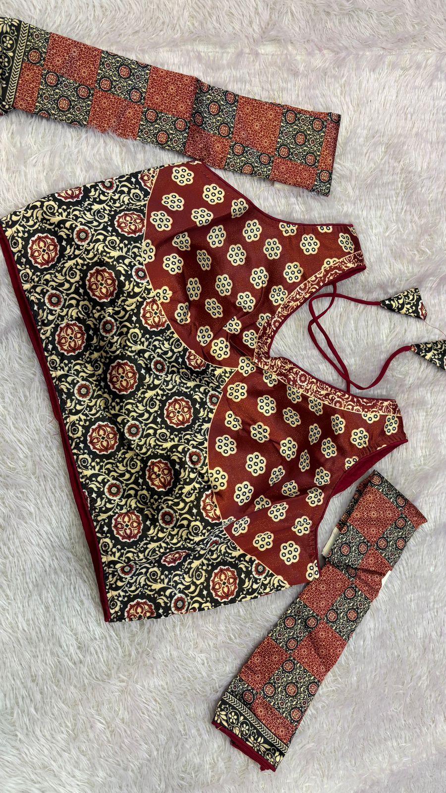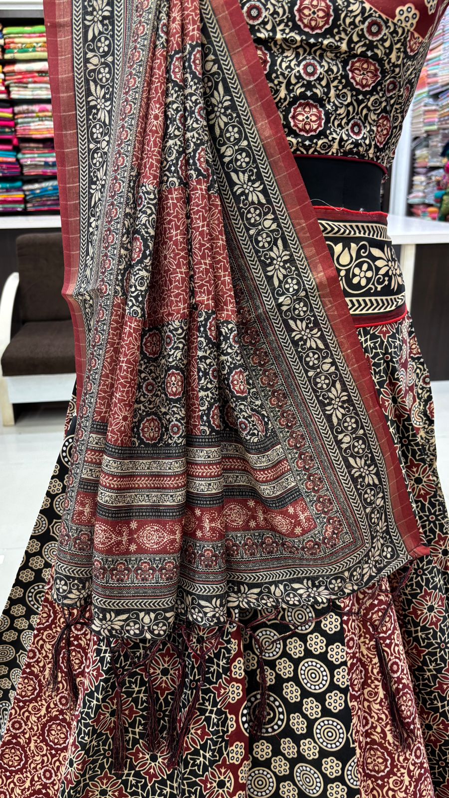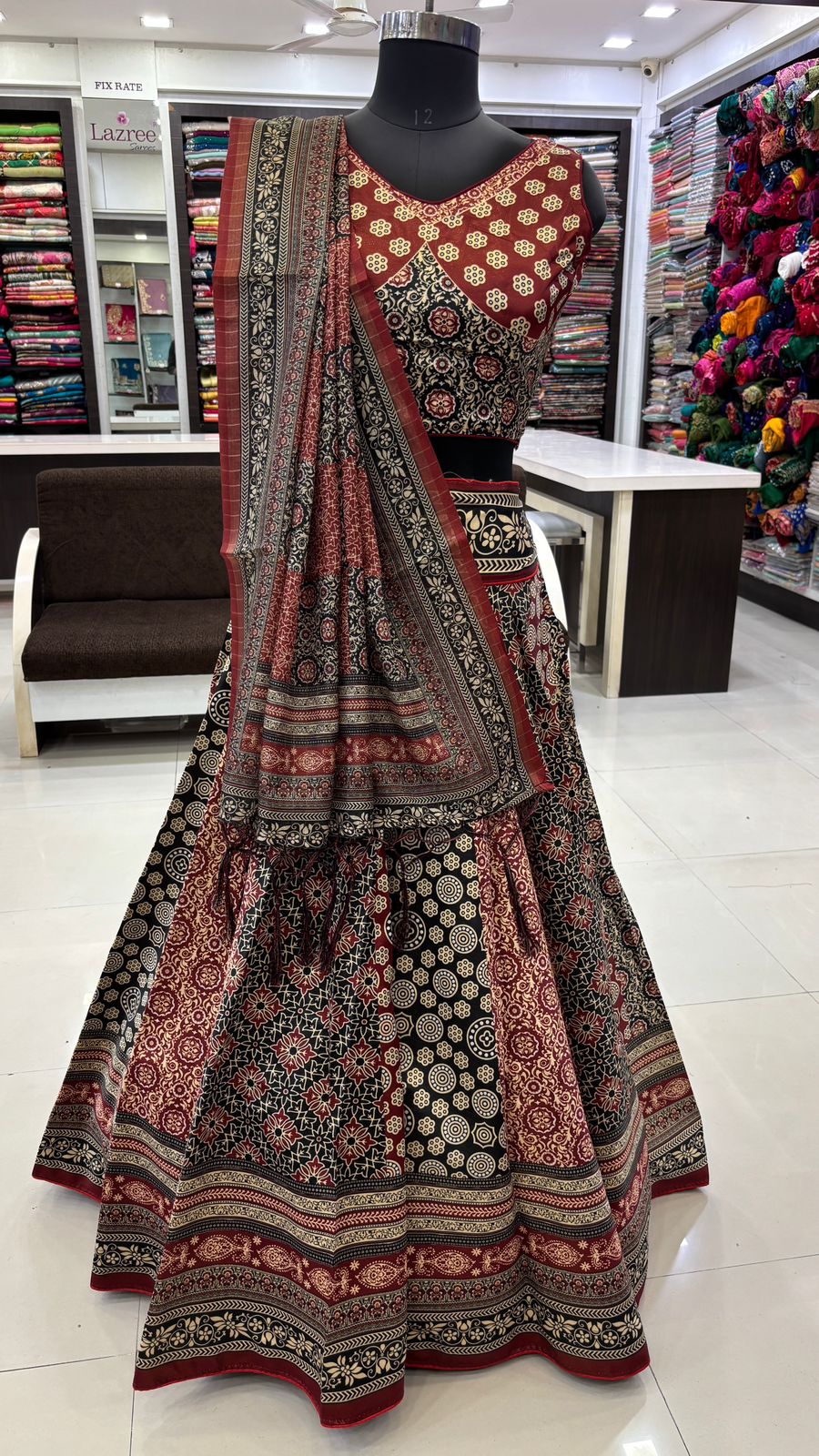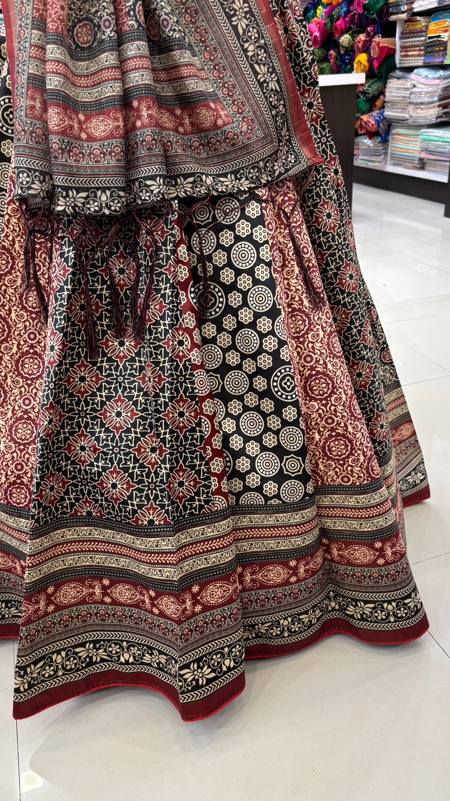 This Lehanga Choli is a celebration of heritage and contemporary style. From the intricate Ajrakh design on the lehanga to the convenience of a ready-made blouse and the playful tussles on the dupatta, it's crafted to be a stunning and versatile choice for a range of celebratory occasions.