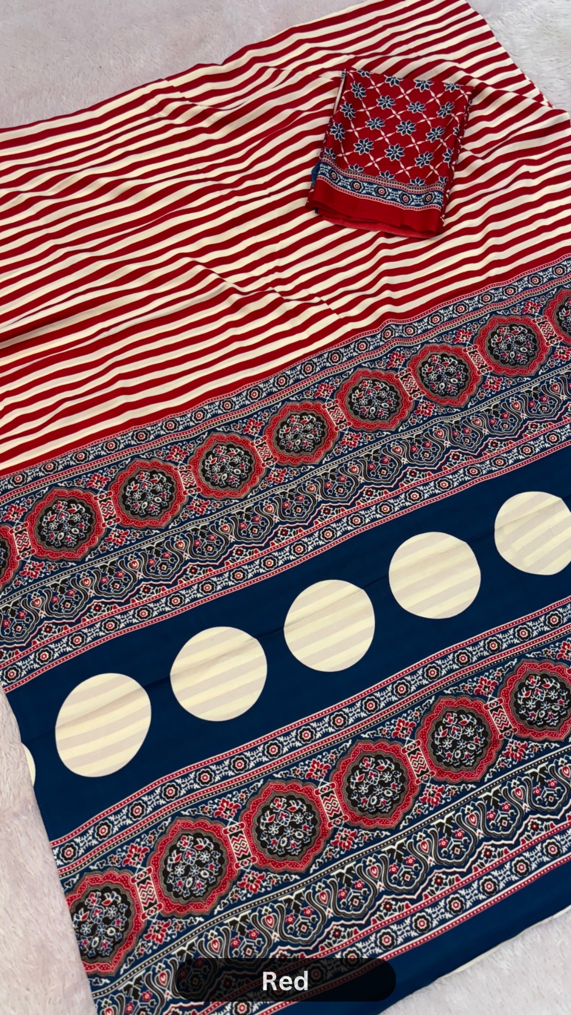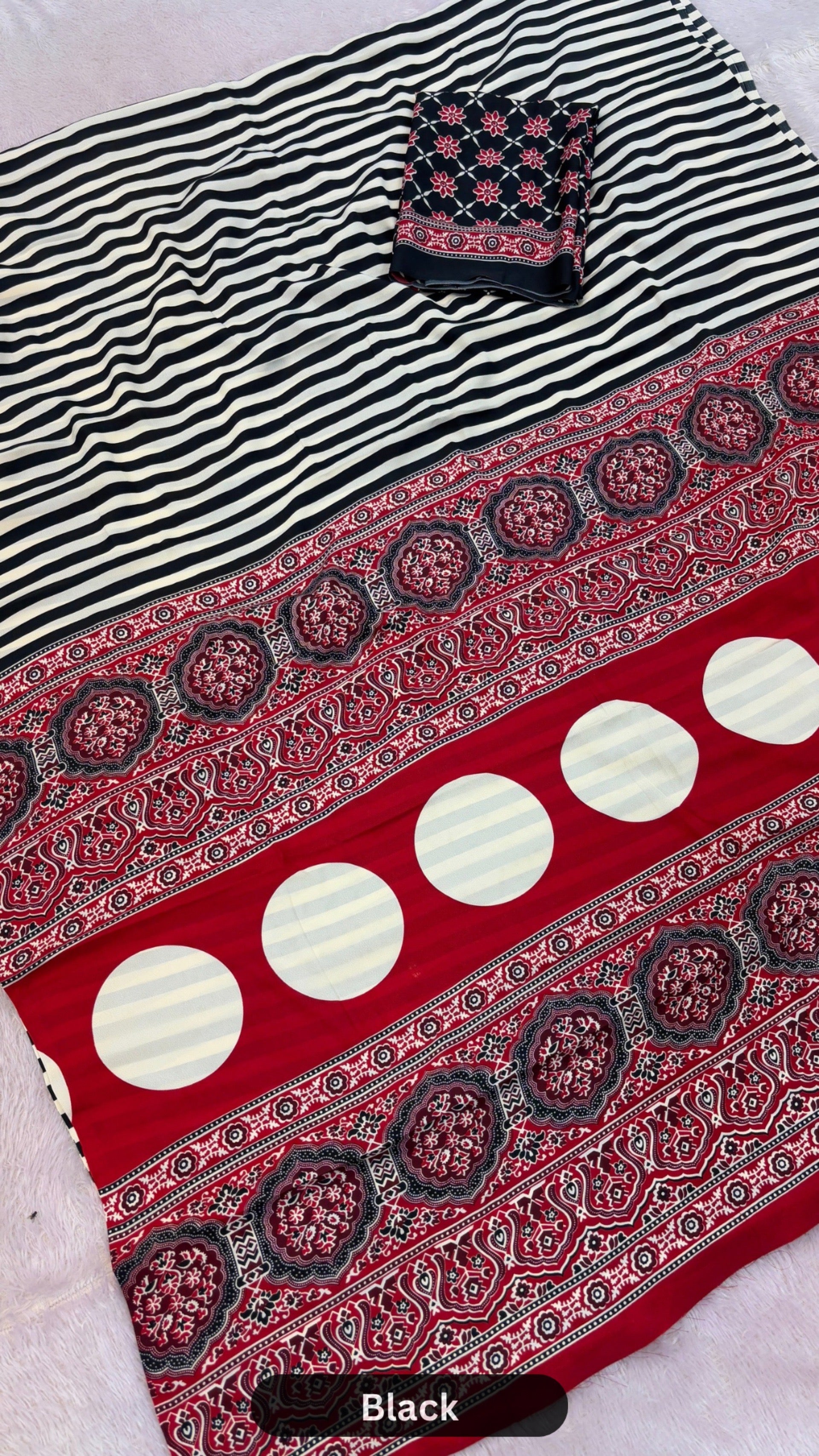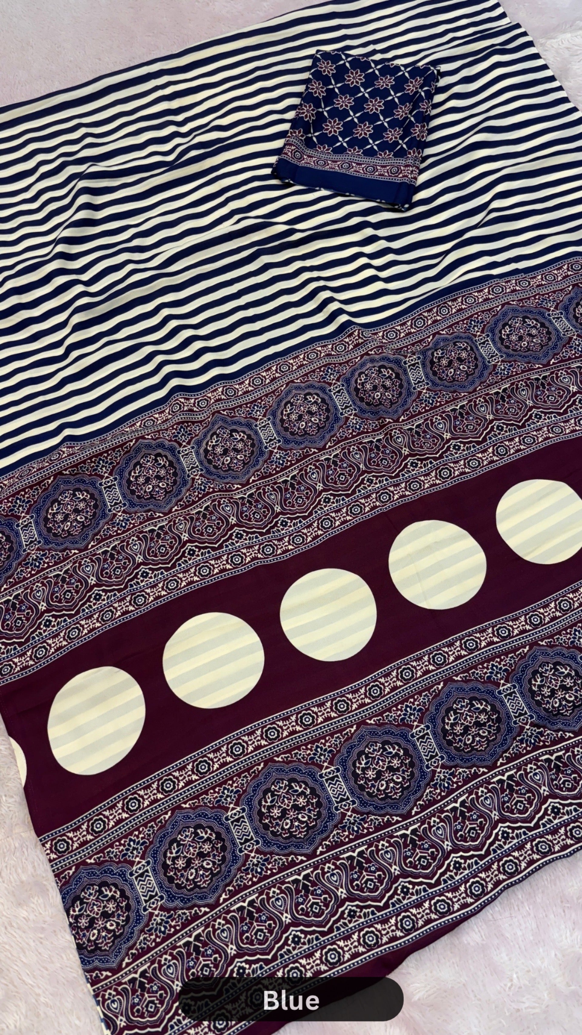 "Pure Crap Silk Ajrakh Stripe Saree - Only ₹650 for Unmatched Elegance!"