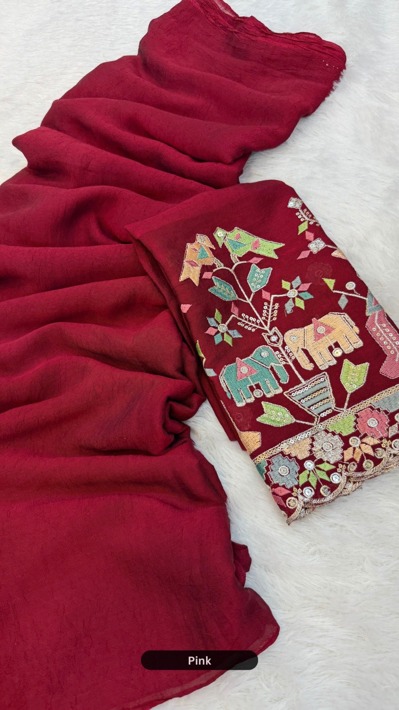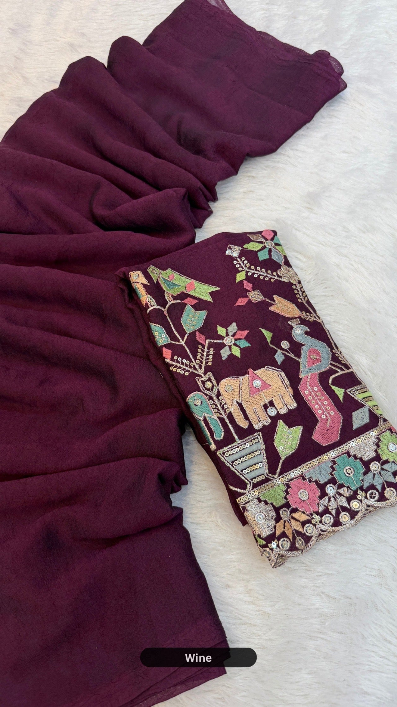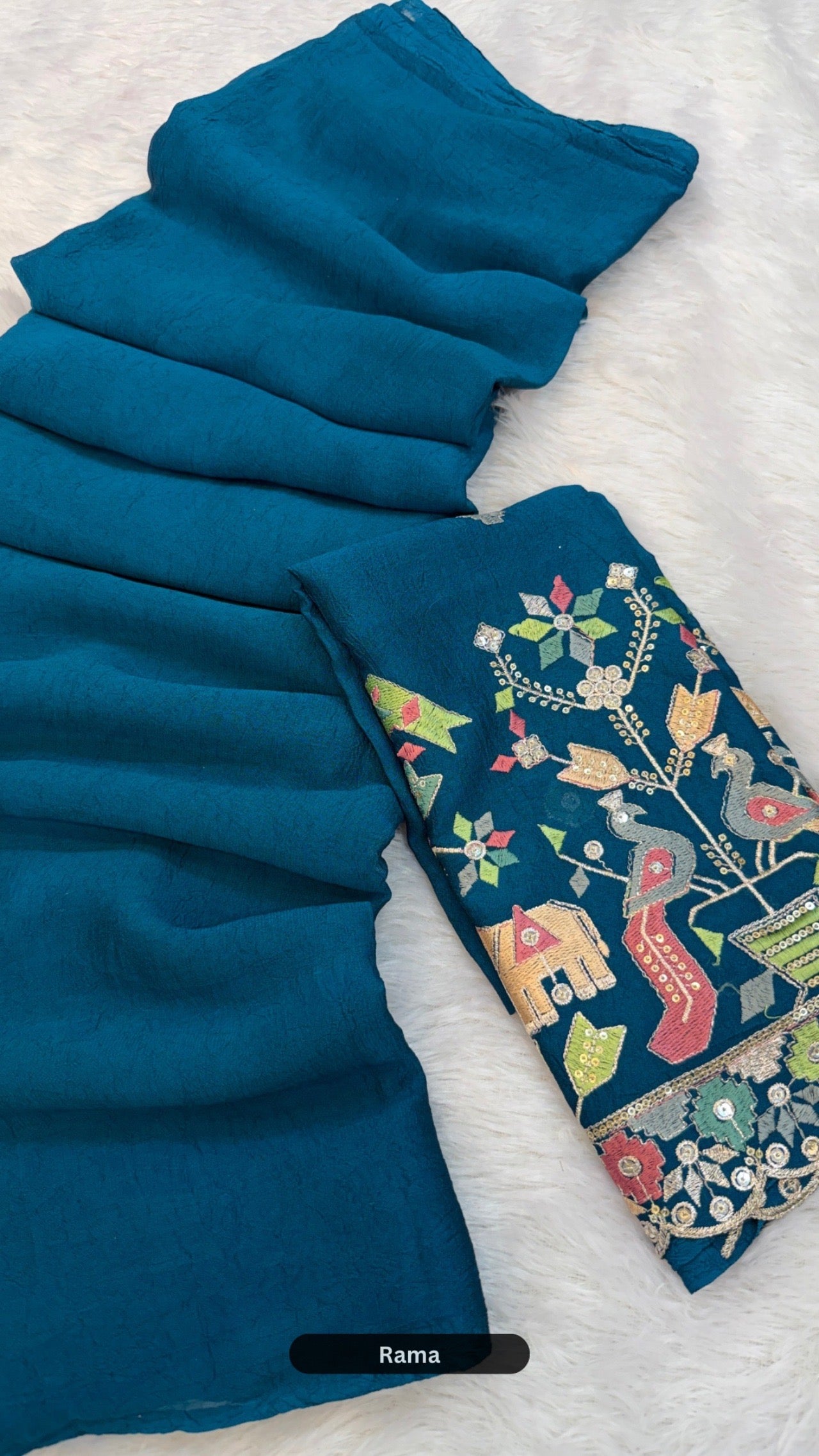 - Blouse Design Pattern: Features animal and motif work, inspired by traditional Kutch embroidery, adding a luxurious ethnic appeal.