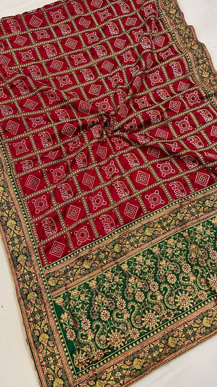 - Material Excellence: Crafted from high-quality Gaji silk, our Gujarati Gharchola Saree guarantees a luxurious feel and enduring durability, ensuring you make a lasting impression.