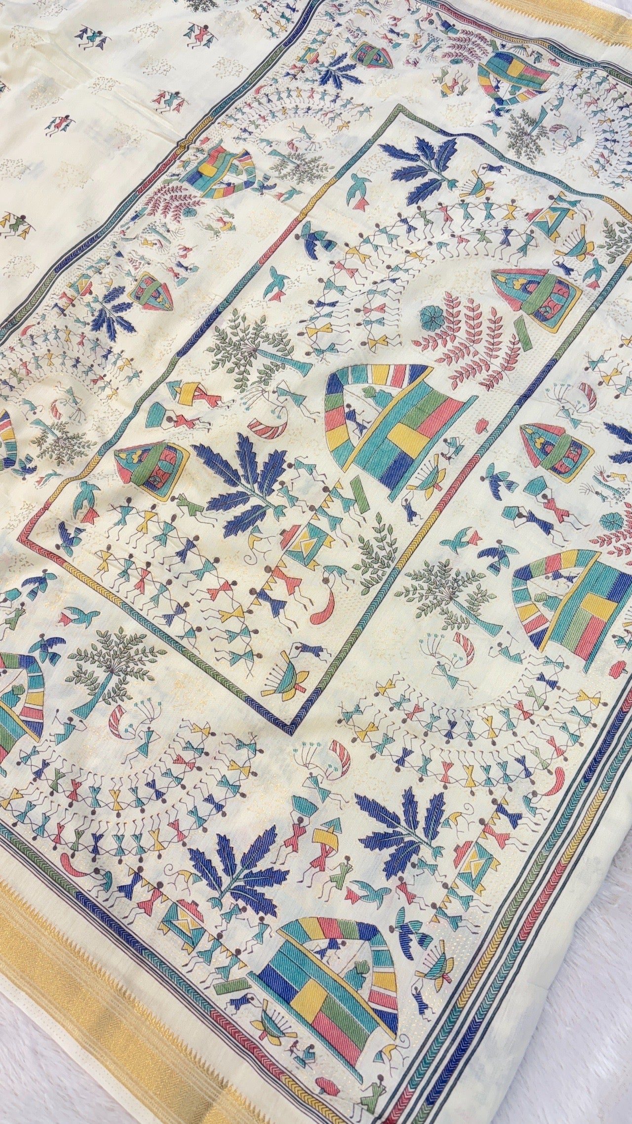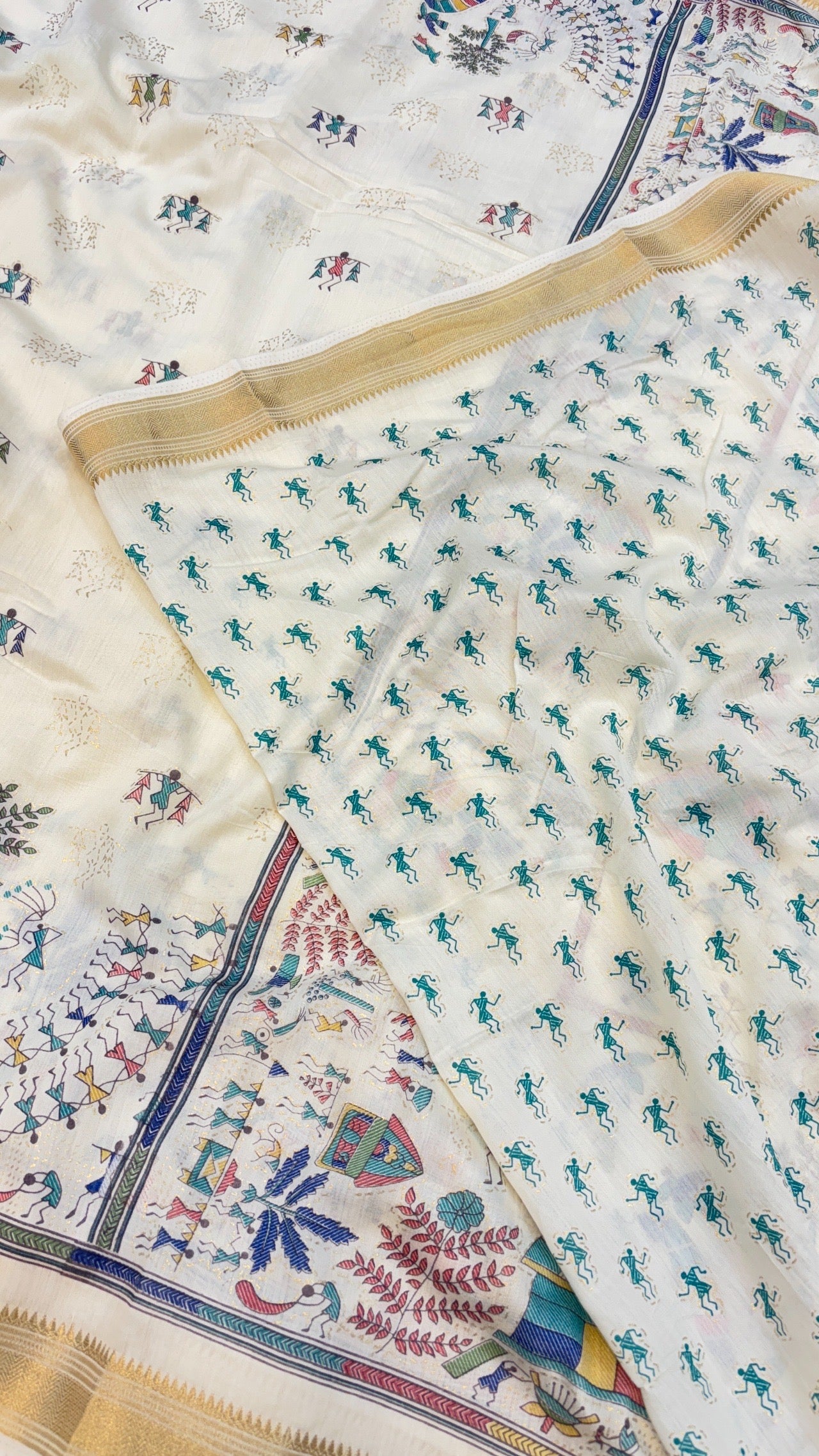 A Cotten silk Mordern saree elegantly combines the richness of Cotten silk with the intricate, artistry of Kalamkari designs.