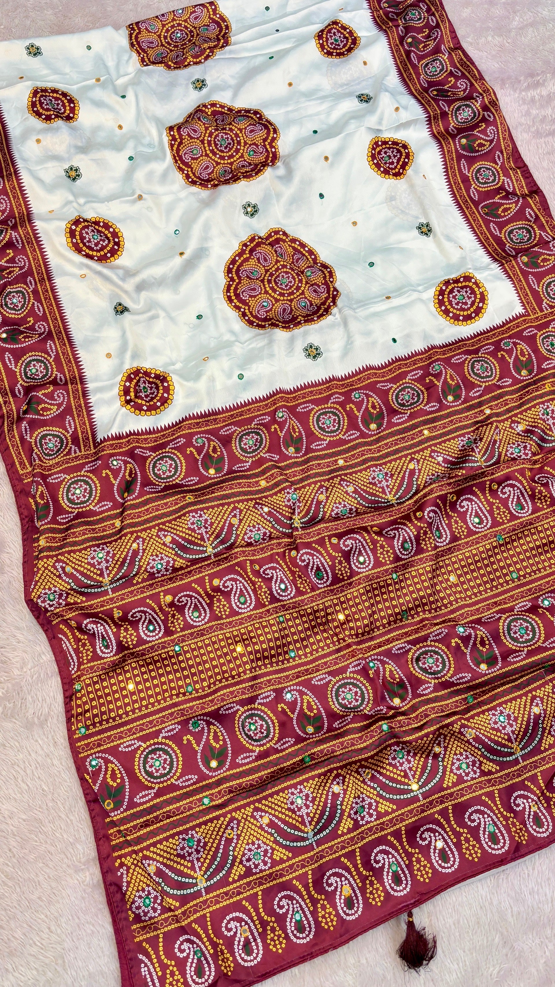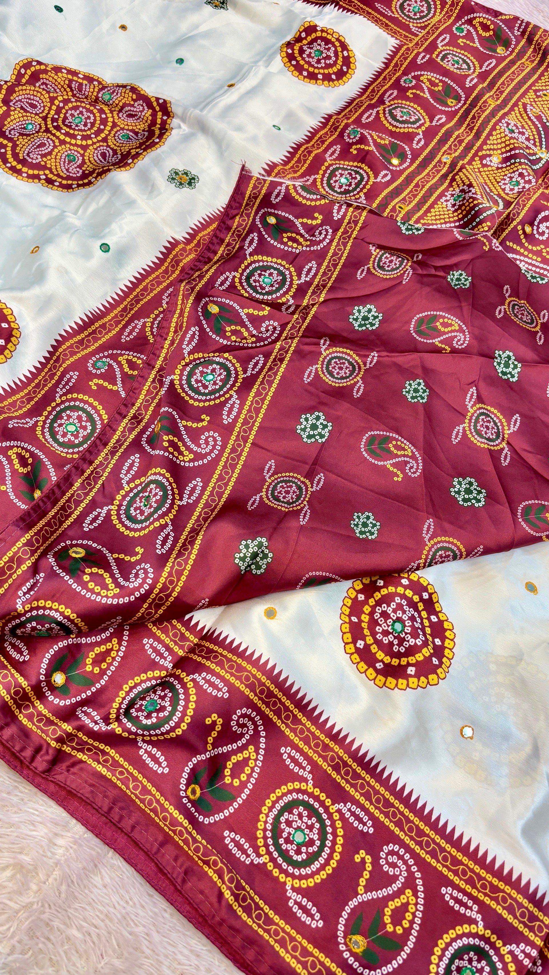 "Order now and drape yourself in the timeless elegance of our Maroon and White Kasumbo Saree for just ₹1290."