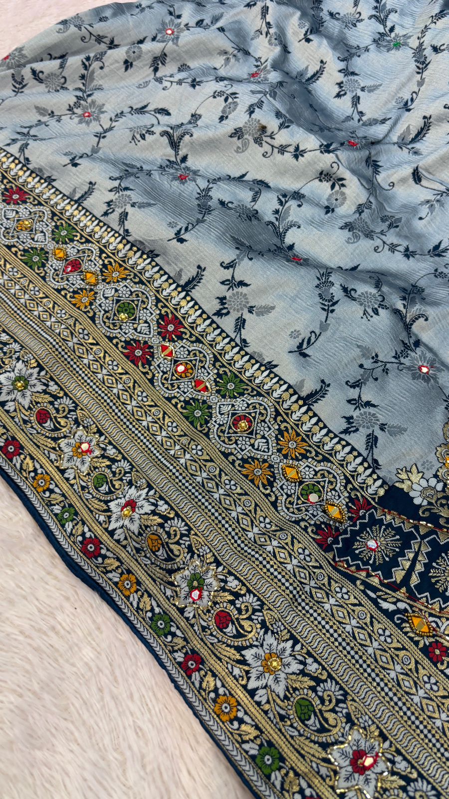 • Work: A detailed blend of traditional techniques including mirror work, kundan embellishments, aariwork, unnwork, and meticulous handwork for a rich finish