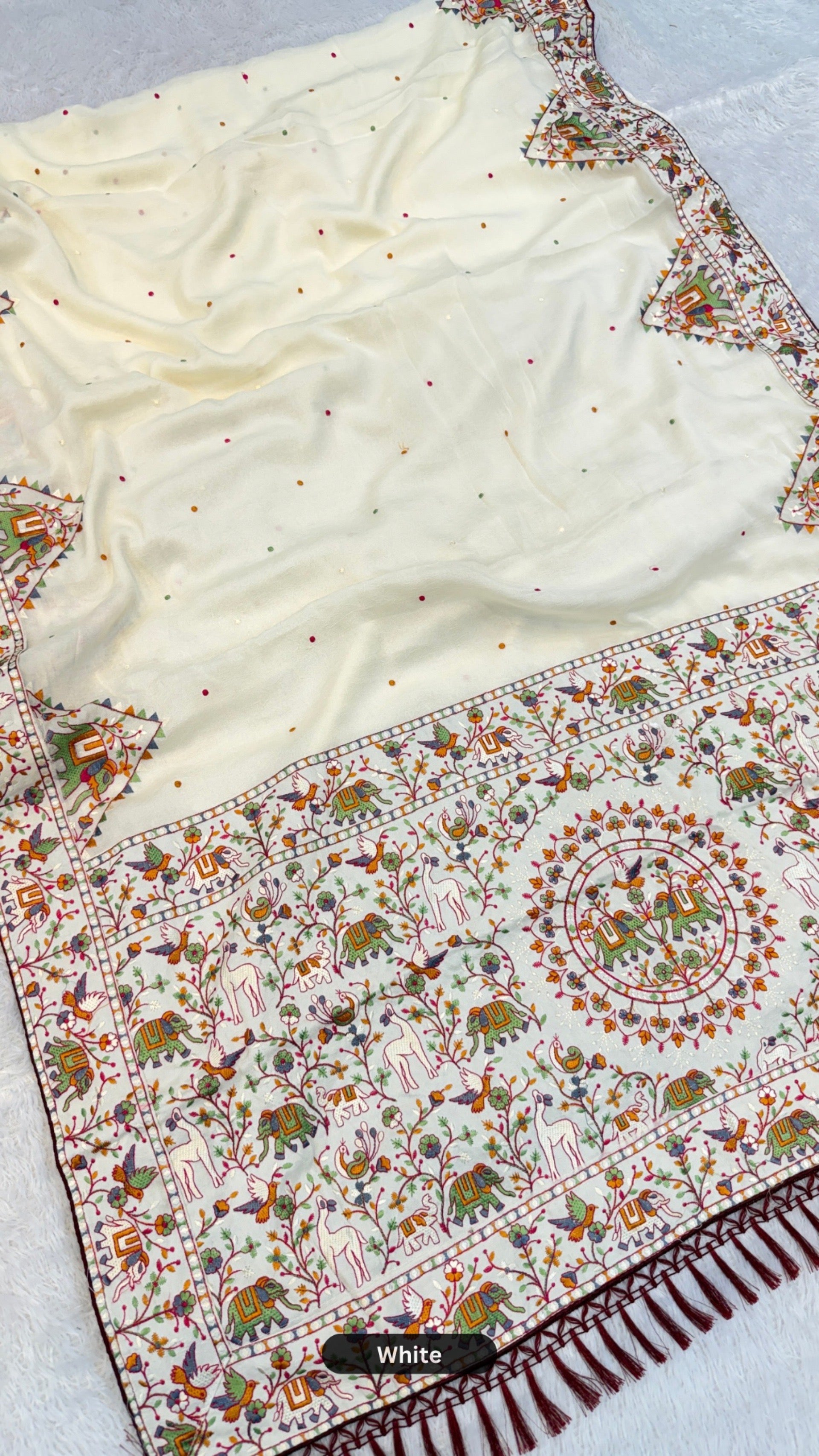 • Work: Features intricate Kutchi work combined with detailed thread embroidery, highlighting the skilled craftsmanship of Kutch. The embroidery adds depth and a unique cultural touch, making the saree truly eye-catching.
