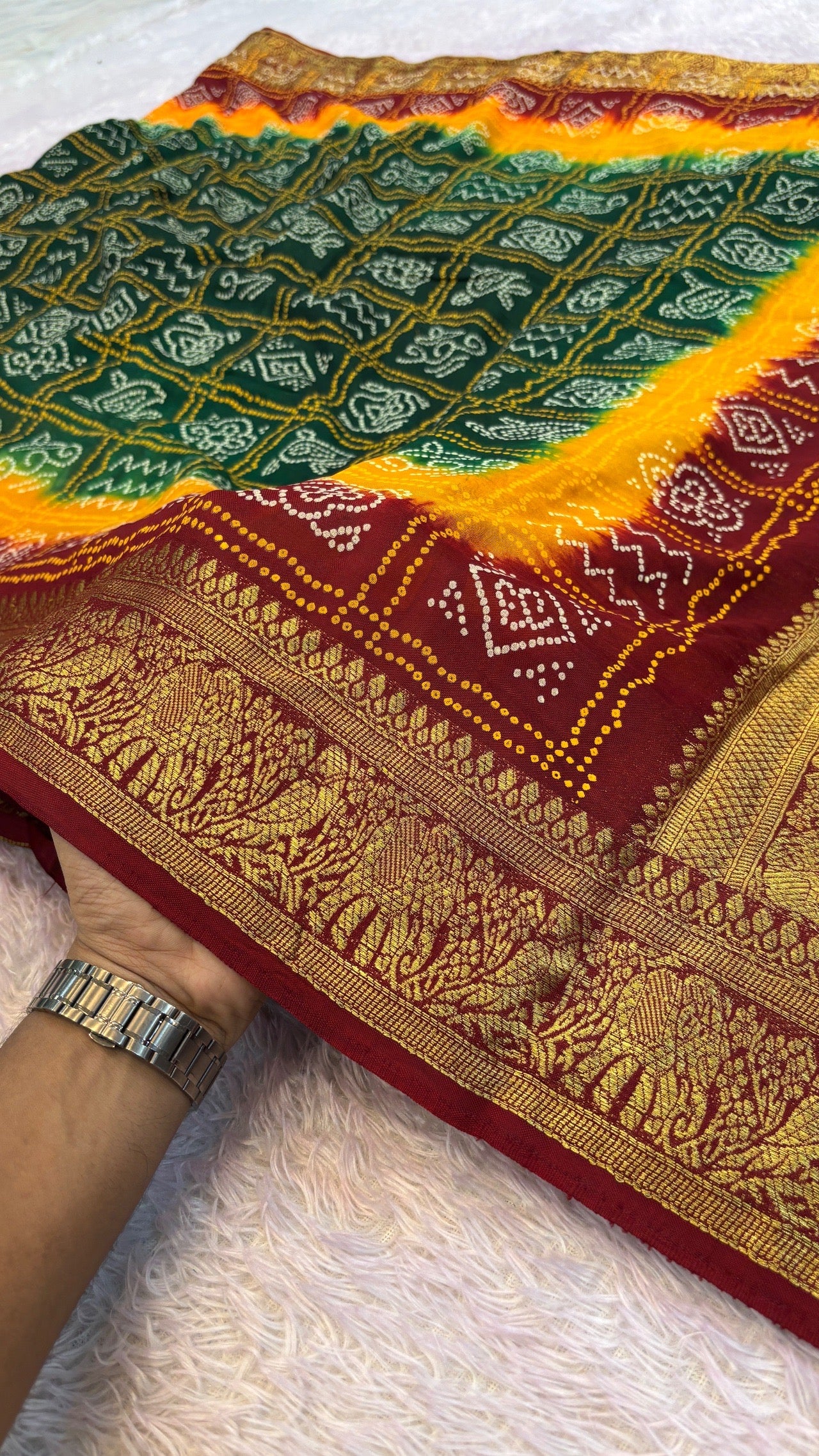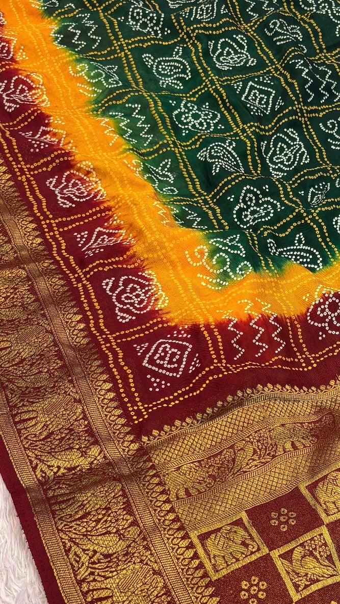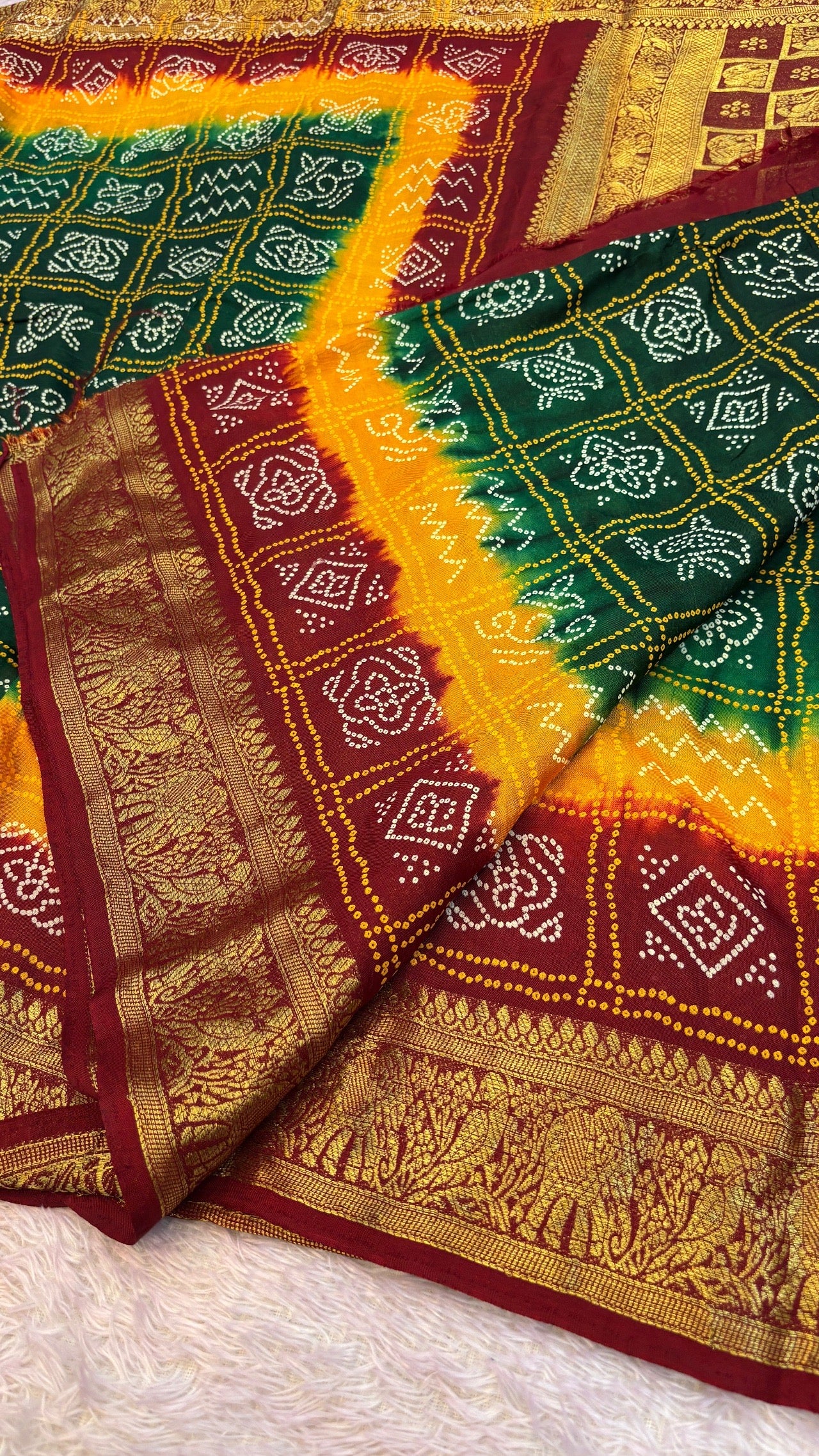 Elevate your ethnic wardrobe with this exquisite Banarasi Gharchola Bandhej Saree, a perfect fusion of traditional craftsmanship and vibrant artistry. The saree features a rich maroon base adorned with intricate golden zari work, adding a touch of royal elegance.