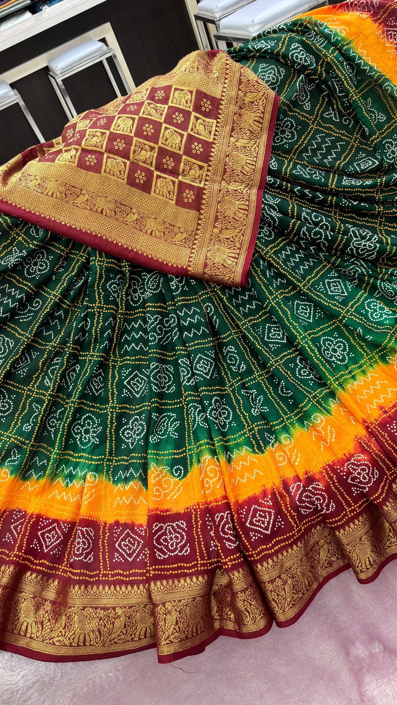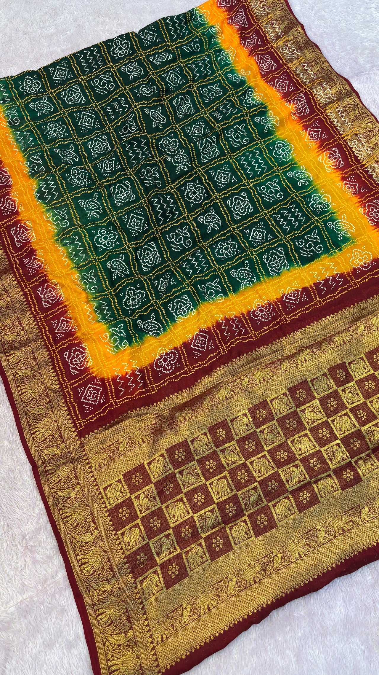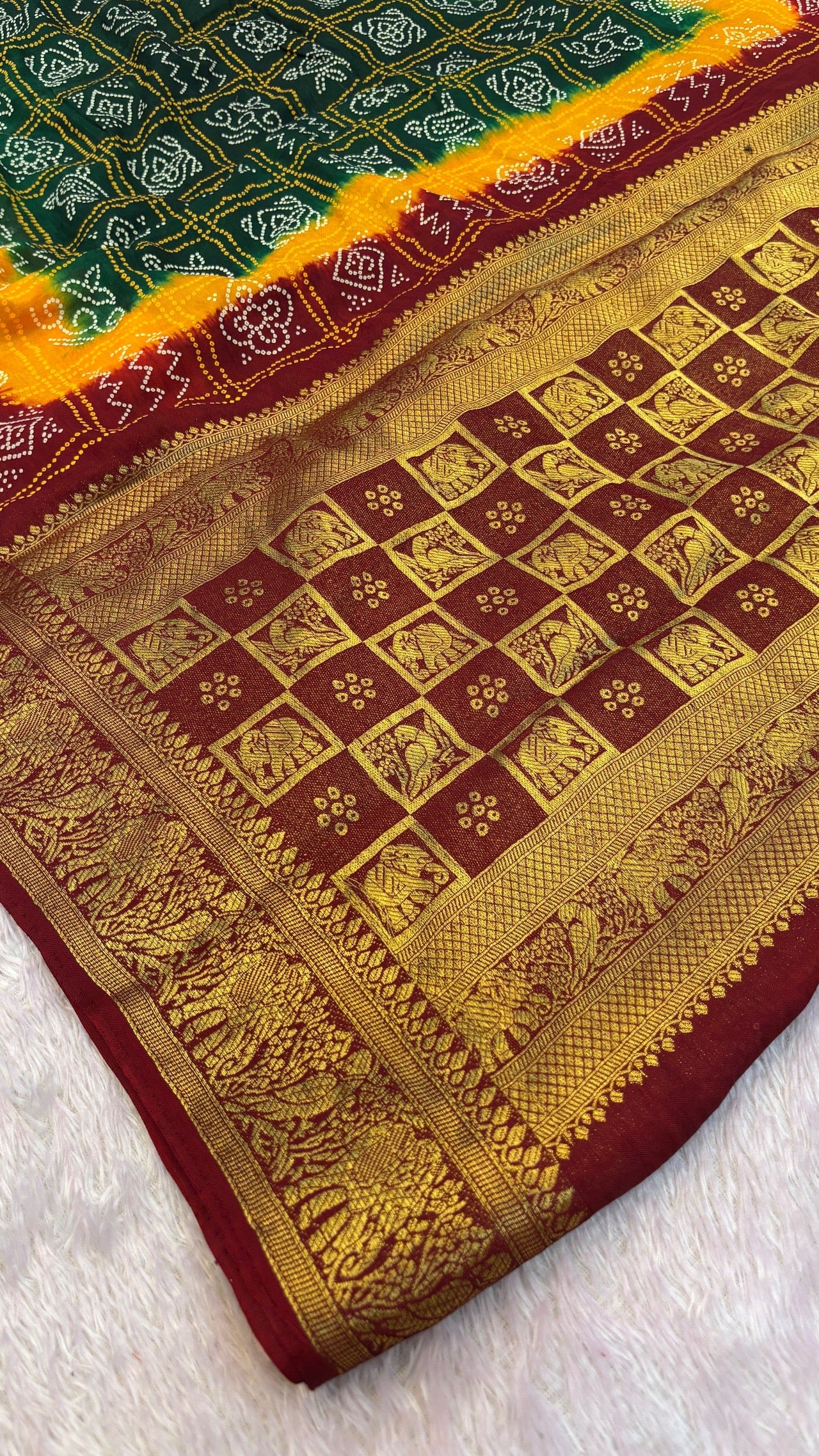 Elevate your ethnic wardrobe with this exquisite Banarasi Gharchola Bandhej Saree, a perfect fusion of traditional craftsmanship and vibrant artistry. The saree features a rich maroon base adorned with intricate golden zari work, adding a touch of royal elegance.