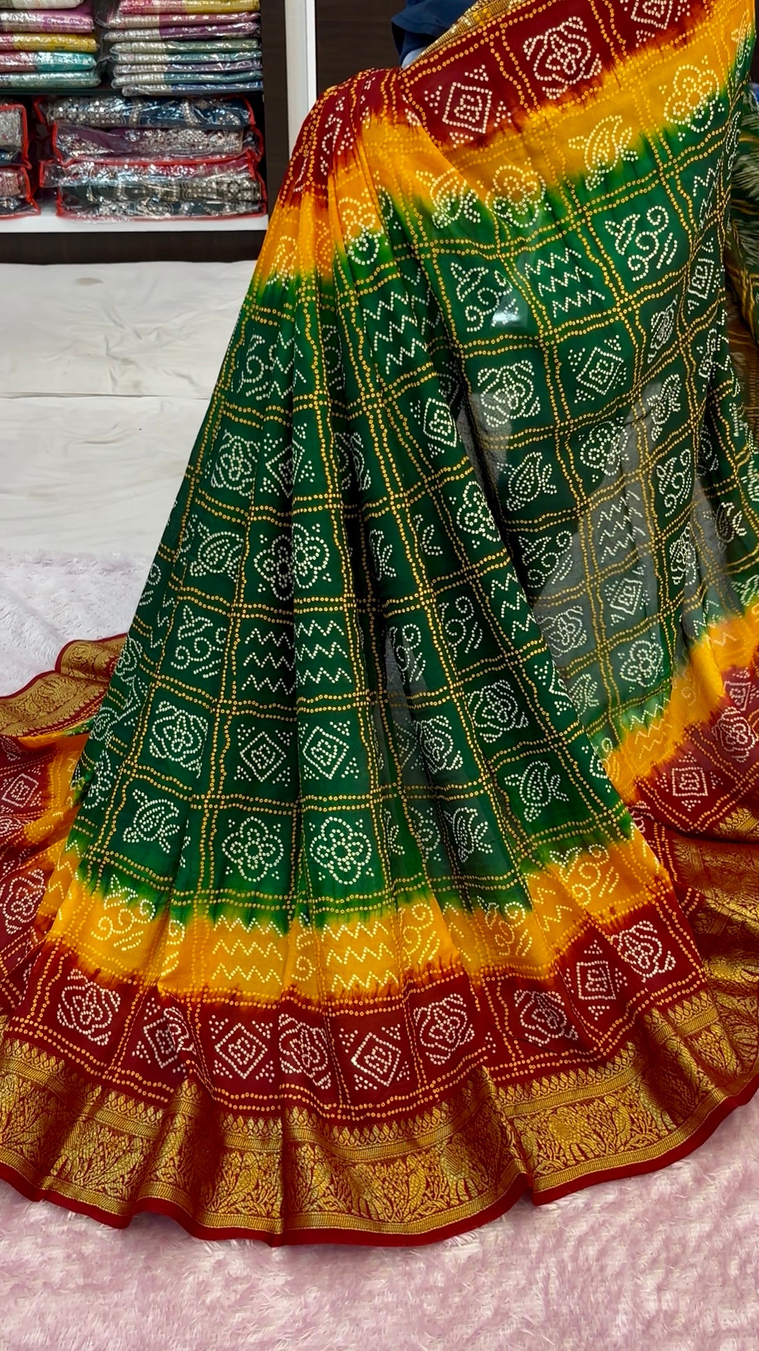 “A regal blend of Banarasi elegance and vibrant Bandhej Gharchola hues, draped in timeless tradition.”