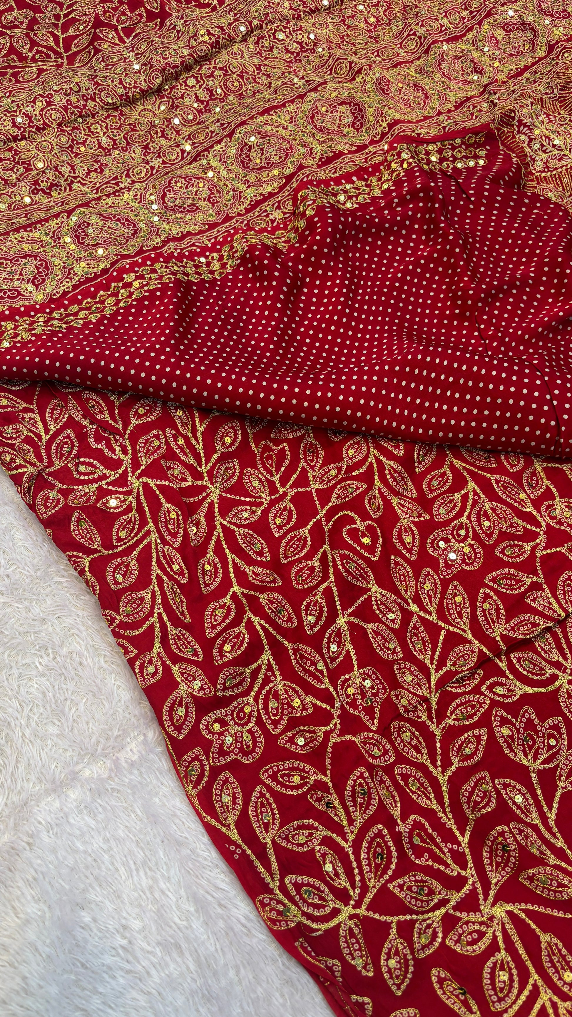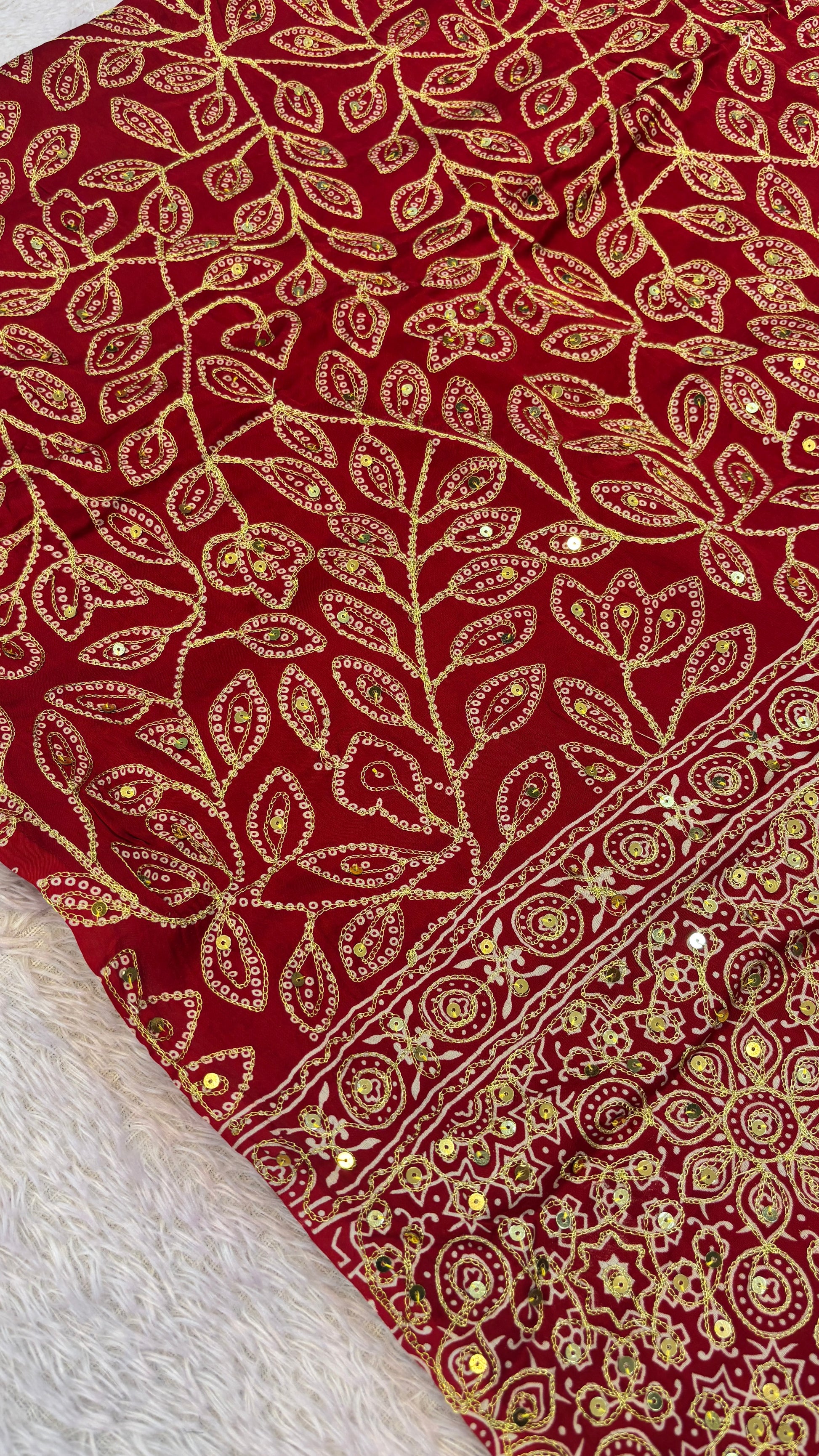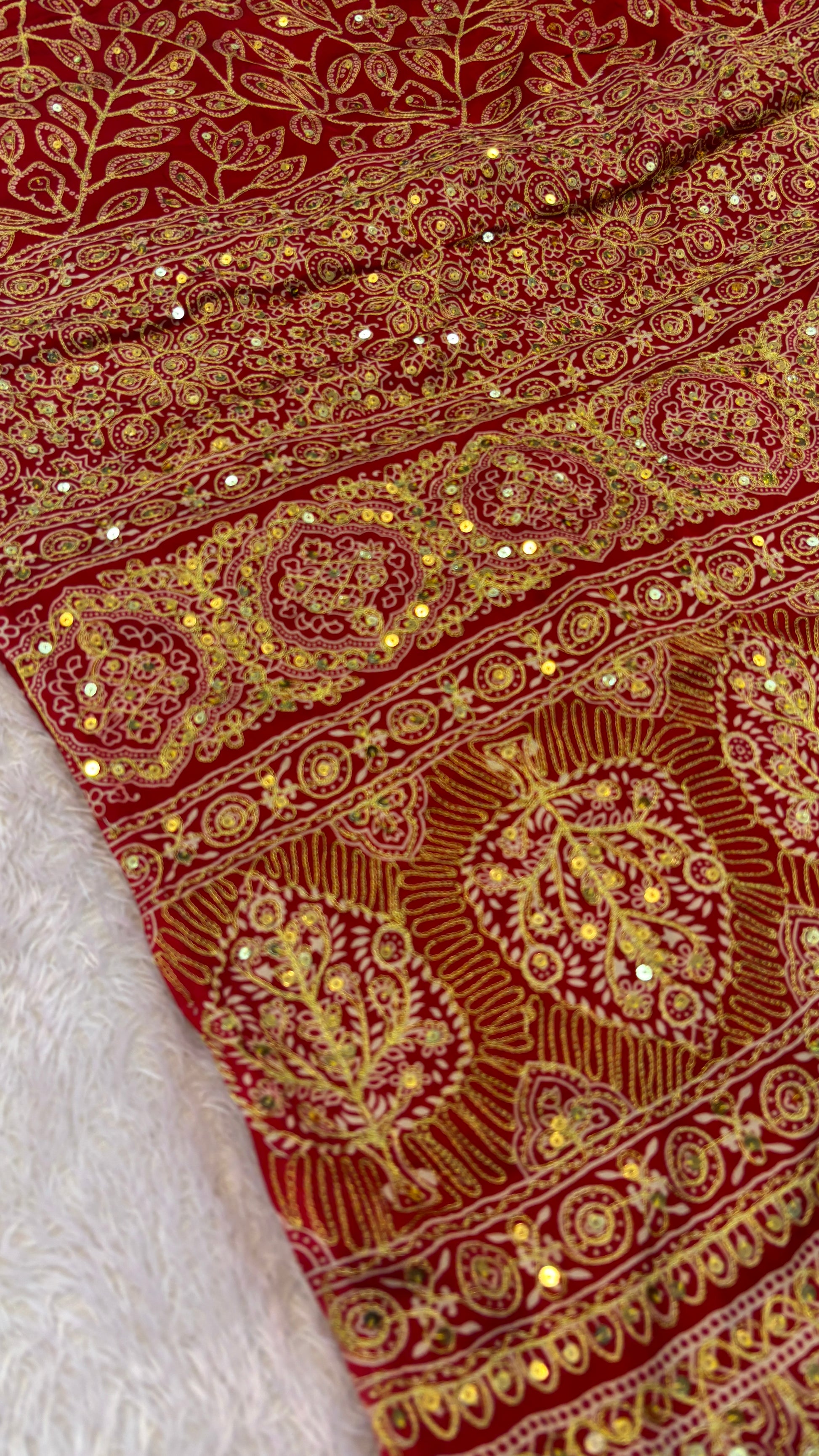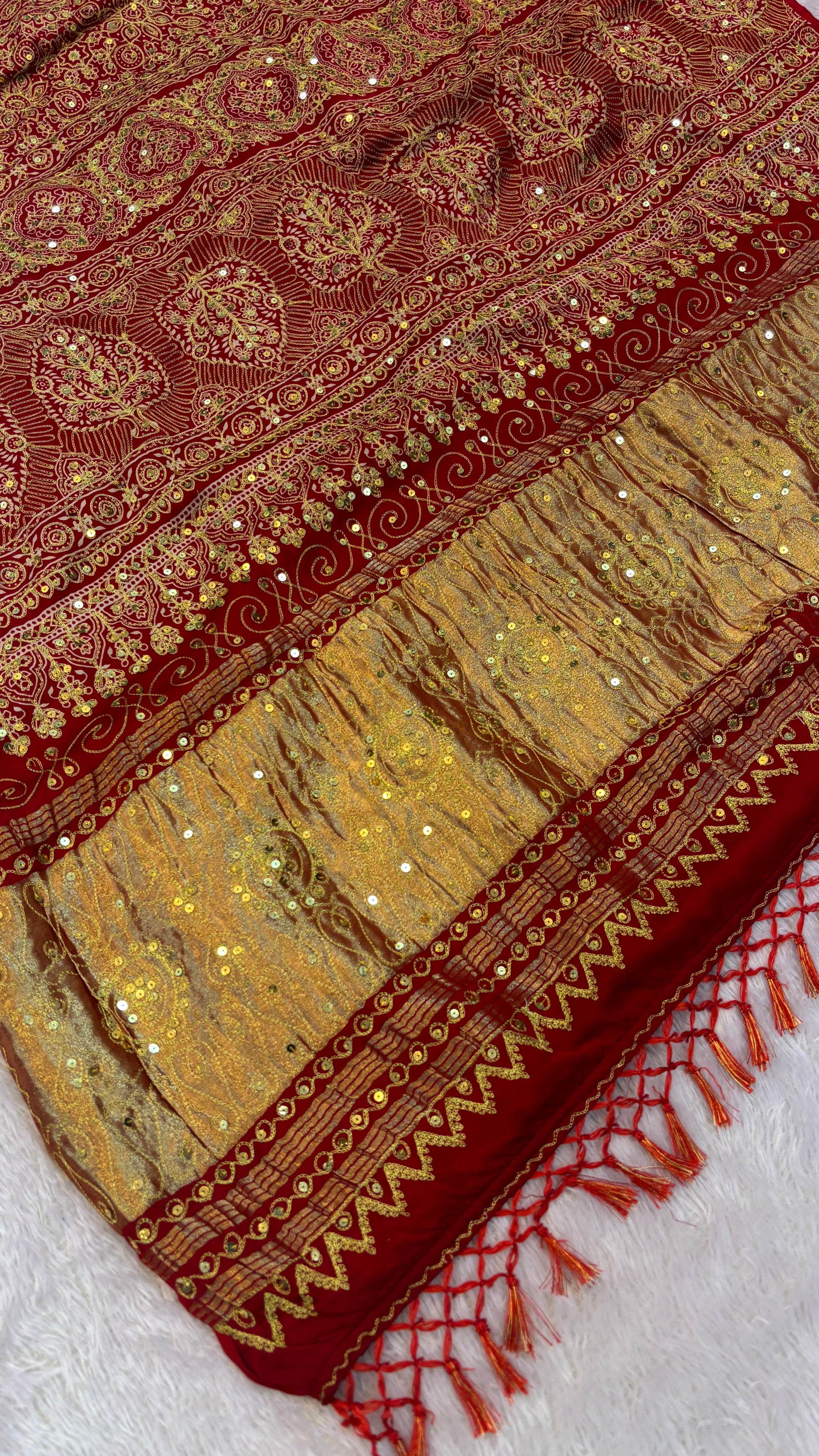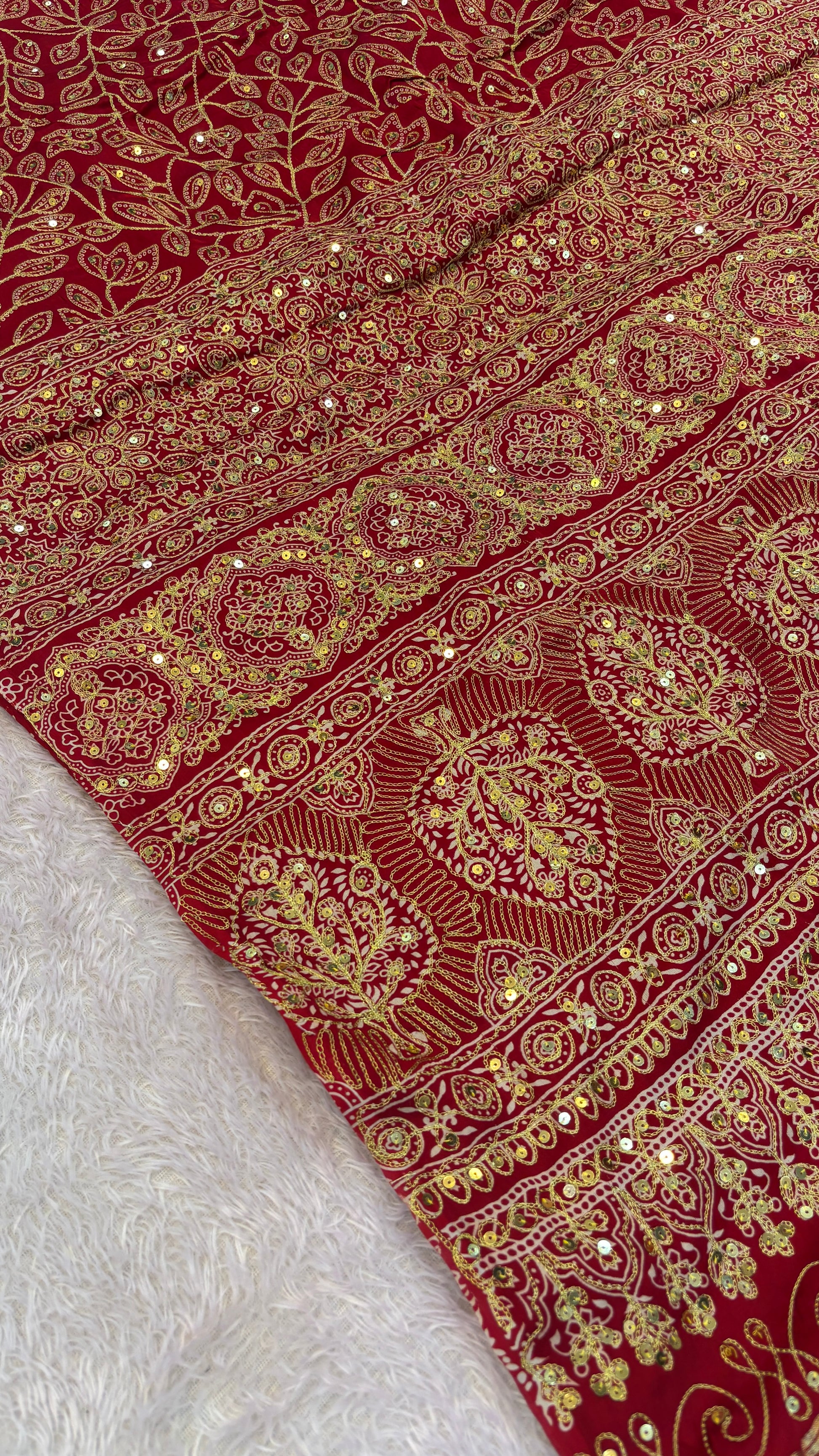Discover the epitome of tradition and elegance with our SvarṇaVastra Saree. Handcrafted with meticulous attention to detail, this saree showcases a harmonious blend of rich red and pristine Sequence, symbolizing purity and passion. The intricate patterns and fine craftsmanship reflect a heritage of artistry that has been passed down through generations. Perfect for weddings, festivals, and special occasions, this saree is a celebration of culture and style, making every moment memorable. Embrace the legacy and grace of our SvarṇaVastra Saree, and step into a world of timeless beauty.